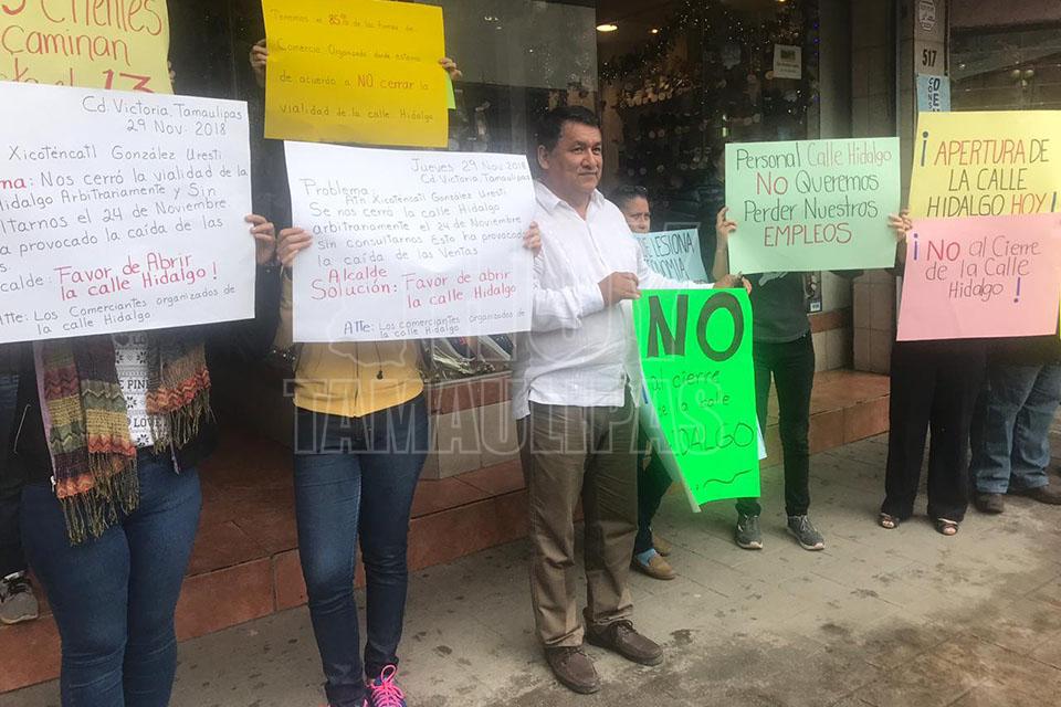 Los manifestantes llevan cartulinas en las que se lee “No al cierre de la calle Hidalgo”, “ALCALDE LESIONA LA ECONOMIA DE LOS COMERCIANTES ESTABLECIDOS”, “Los clientes no caminan hasta el 13”, “Personal Calle Hidalgo No Queremos Perder Nuestros EMPLEOS”, entre otras.