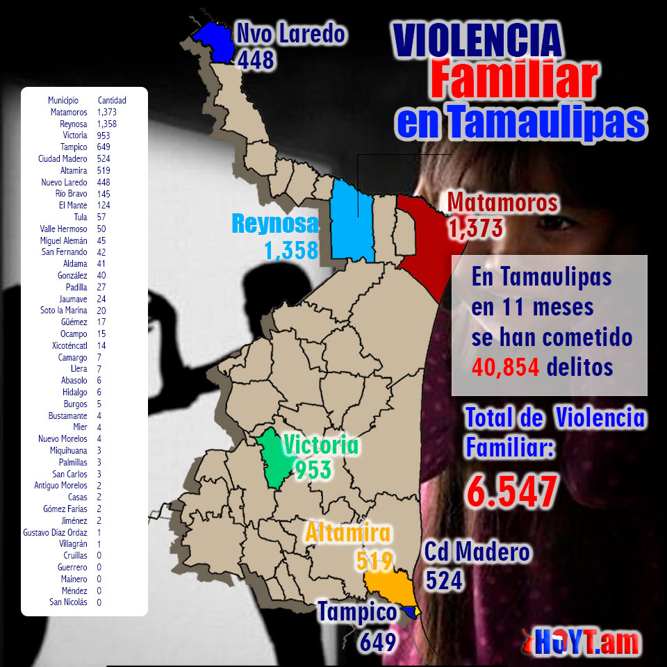 Durante el 2018, de enero a noviembre, según el último reporte del Secretariado Ejecutivo del Sistema Nacional de Seguridad Pública, en Tamaulipas se cometieron 6,547 delitos relacionados a la violencia familiar.