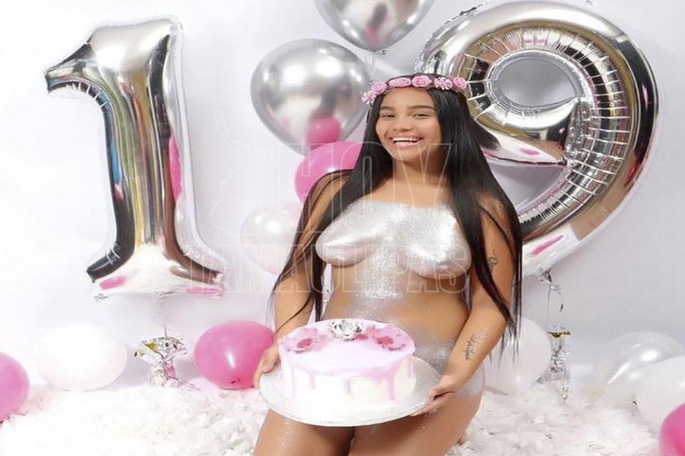 Sin embargo, las fotografías muestran a una joven cuyo atuendo son solo una diadema de flores, un pastel y pintura color plata.