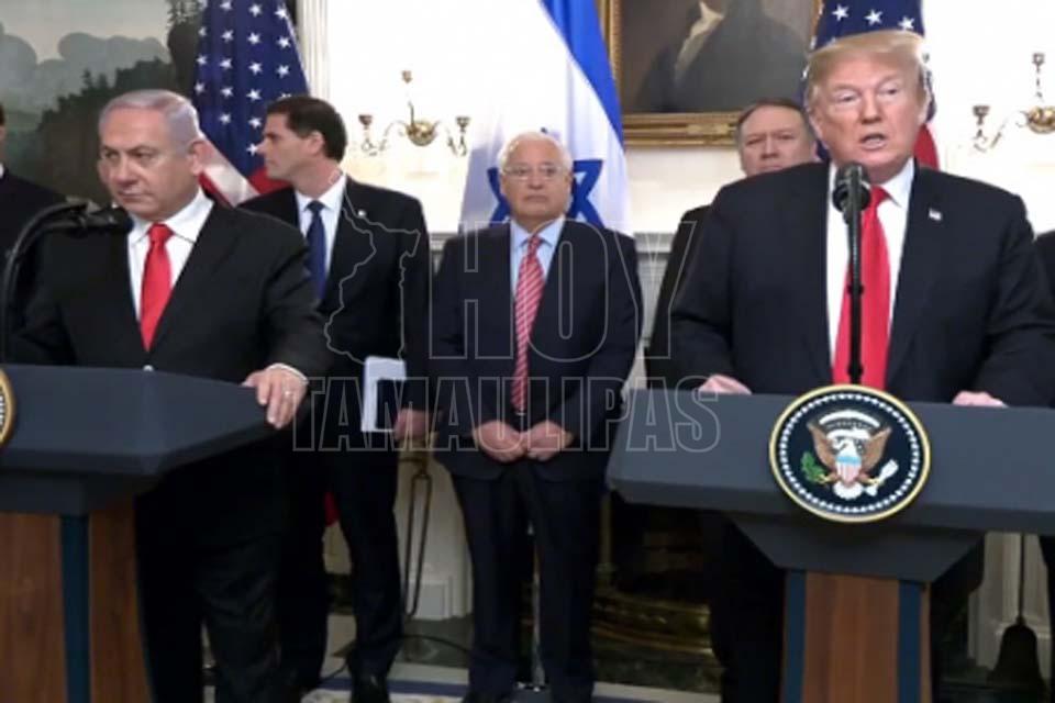 El documento fue firmado al término de una conferencia de prensa conjunta con el primer ministro israelí, Benjamin Netanyahu, en la que Trump elogió la "poderosa" relación entre Estados Unidos e Israel y condenó el ataque con cohetes ocurrido esta mañana al norte de Tel Aviv, que dejo siete lesionados.