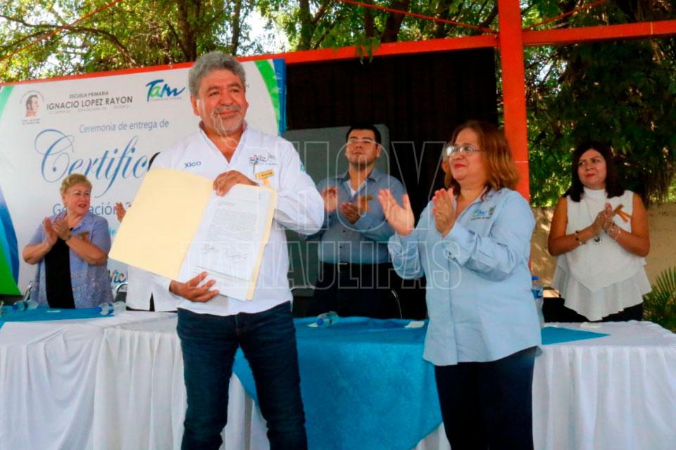 Ciudad Victoria, Tamaulipas. - Durante la ceremonia de entrega de certificados a la generación 2013 - 2019, el Dr. Xico hizo entrega del documento que acredita a la Escuela Primaria “Ignacio López Rayón”, como beneficiaria única, de un predio de 609 metros cuadrados colindantes con la institución, y que fuera donado para ese fin durante la décimo Tercera Sesión Ordinaria de Cabildo.