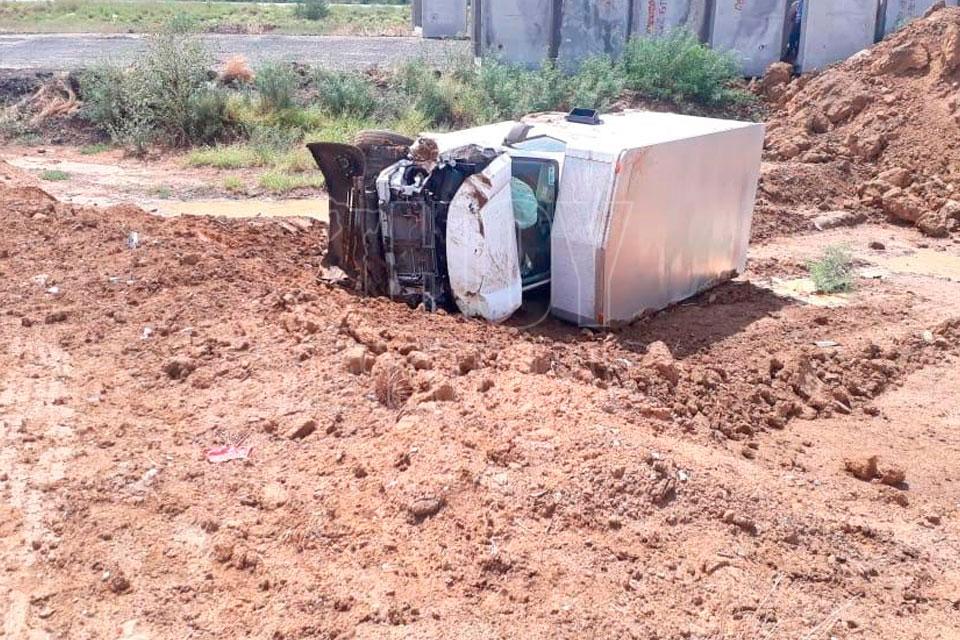 Nuevo Laredo, Tamaulipas. - Un operador sobrevivió a la volcadura del pequeño camión que conducía y en el que transportaba alimentos, hechos ocurridos en la Carretera Nacional.