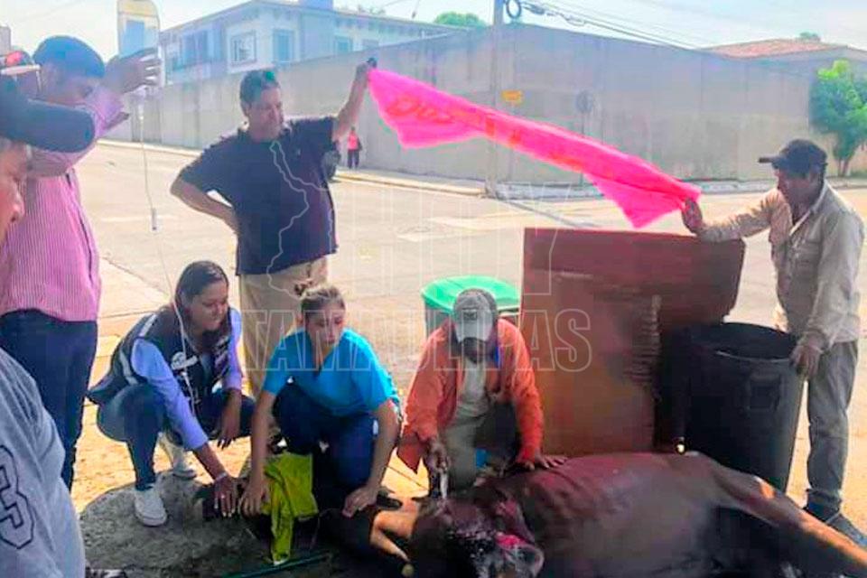 Tampico, Tamaulipas. - Vanos fueron los esfuerzos que varios rescatistas hicieron para salvarle la vida a un caballo que se desplomó en plena calle cuando jalaba una carreta, cuyos dueños se dedican a la compra de fierro viejo en Tampico.