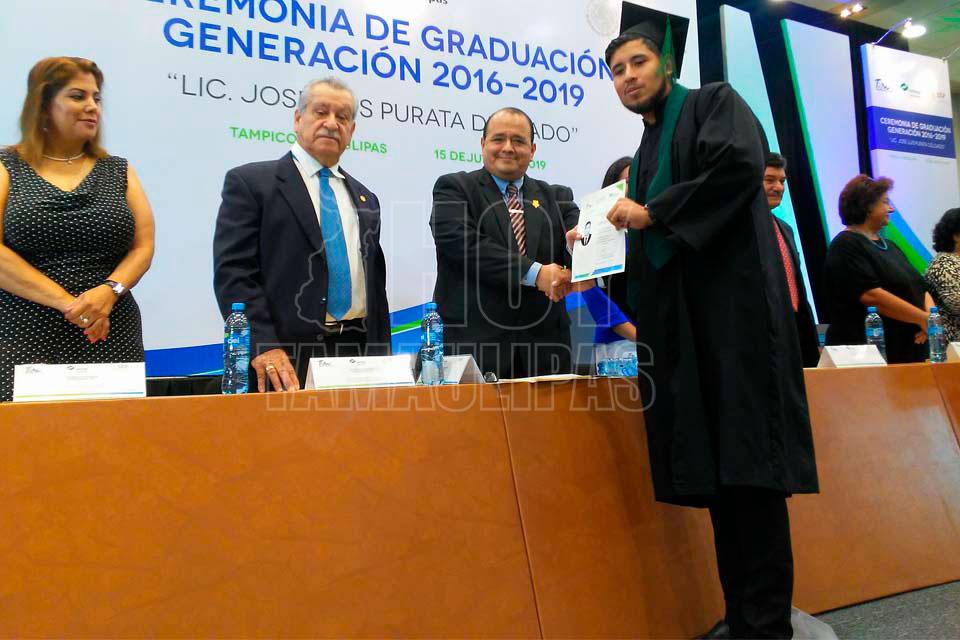 En la magna ceremonia, realizada en el Centro de Convenciones y Exposiciones, estuvieron, además, el director del Conalep, plantel Tampico, Benjamín Lozano Morales; y en representación del padrino de la generación, José Luis Purata Delgado, estuvo su hija Esthela Purata.