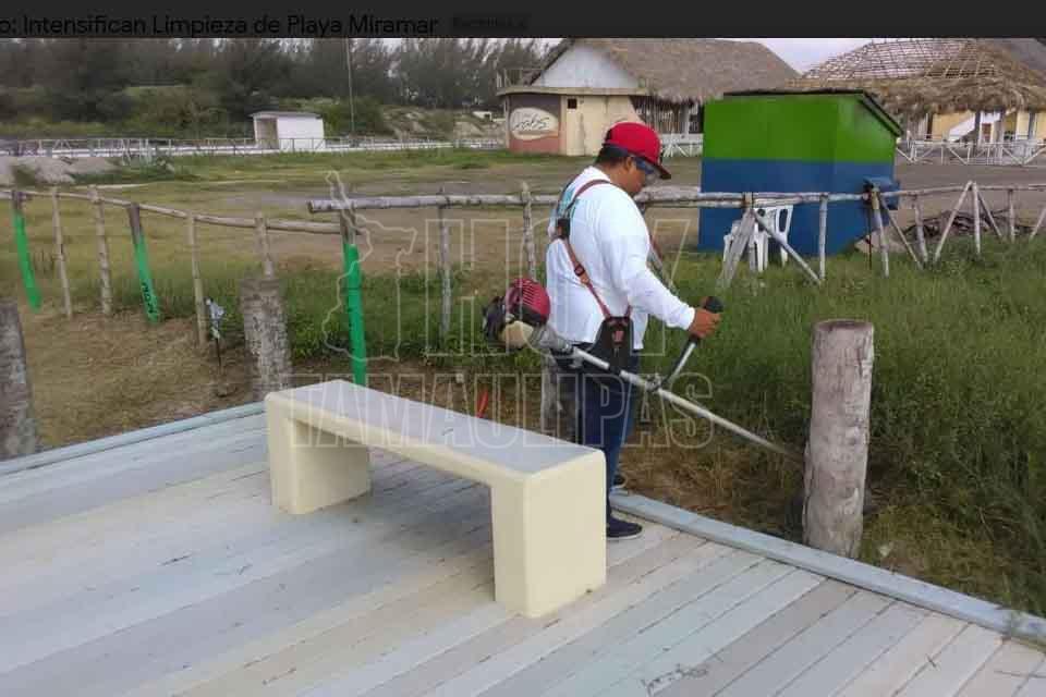 Ciudad Madero, Tamaulipas. - Para garantizar a los visitantes instalaciones y servicios de calidad en este periodo vacacional de verano, por indicaciones del Presidente Municipal de Ciudad Madero, Adrián Oseguera Kernion, se han intensificado las labores de limpieza y mantenimiento de Playa Miramar; uno de los principales atractivos turísticos de la urbe petrolera.