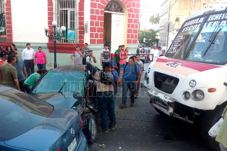 Tampico, Tamaulipas. - Fuerte choque múltiple se registró la tarde de este viernes en pleno centro de la ciudad en donde una persona quedó prensada dentro de su unidad al ser impactado por un autobús urbano; aparentemente el lesionado se pasó el lato obligatorio.