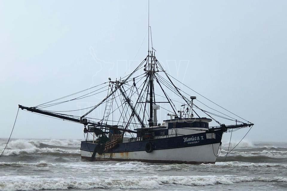 El barco de nombre “Mónica I”, de la empresa Mónica Patricia Cevallos Alejandre, se encuentra encallado exactamente del lado sur de la playa Bagdad de Matamoros, Tamaulipas a unos dos kilómetros del acceso al balneario natural.