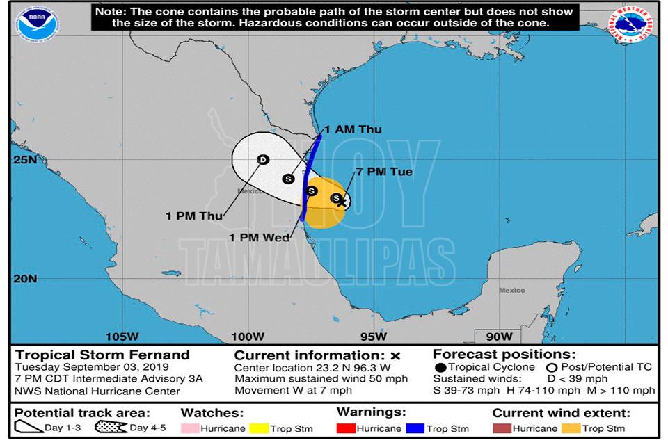 Ciudad Victoria, Tamaulipas. - La Tormenta Tropical Fernand sigue avanzando hacia La Pesca, Tamaulipas, ubicándose a 165 kilómetros y podría tocar tierra a más tardar a la una de la mañana del jueves, esto según previsiones del Centro Nacional de Huracanes con sede en Miami, Florida (EE.UU.).