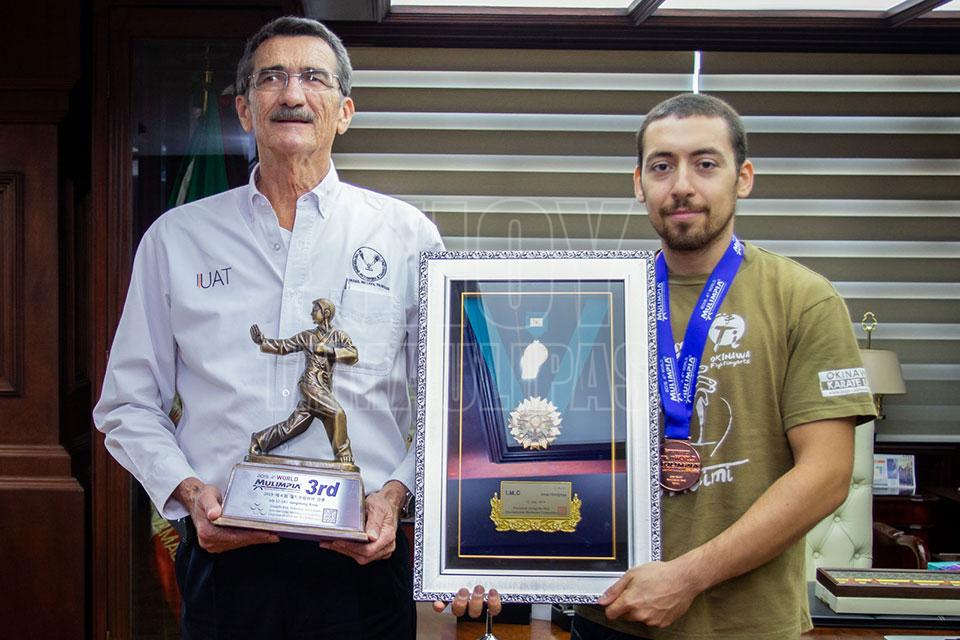 Ciudad Victoria, Tamaulipas. - Orgullosamente egresado de la Universidad Autónoma de Tamaulipas (UAT), José Manuel Hinojosa Haces acudió con el Rector José Andrés Suárez Fernández para agradecerle el apoyo brindado a través de la casa de estudios, que hizo posible su participación en el 4º. Torneo Abierto de Artes Marciales Mulimpia 2019 en Corea del Sur.
