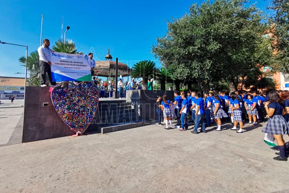 Reynosa, Tamaulipas. - Estudiantes de varias escuelas de Reynosa realizaron una marcha dentro de las actividades la Semana del Bienestar Creando Escuelas Favorables, organizada por la Secretaría de Salud.