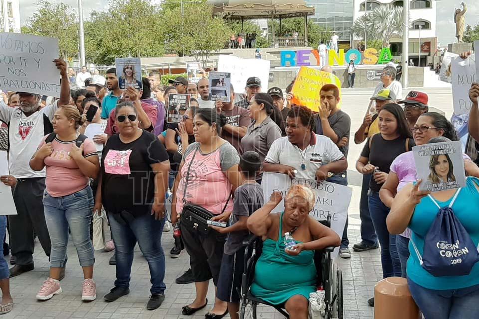 Reynosa, Tamaulipas. - Cerca de un centenar de personas entre comerciantes informales y carretoneros, se apersonaron en las afueras de la Presidencia de Reynosa exigiendo hablar con la alcaldesa Maki Ortiz, para que desista de sus peticiones ante el Congreso porque dañaría más su ya descalabrada economía familiar.