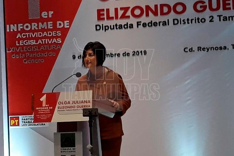 Reynosa, Tamaulipas. - La diputada federal por el Distrito 2 de Tamaulipas, Olga Juliana Elizondo Guerra, rindió su informe legislativo a la ciudadanía y dio cuenta de las iniciativas de ley que impulsó en la Cámara de Diputados, así como de su trabajo como coordinadora parlamentaria durante el primer año de sesiones.