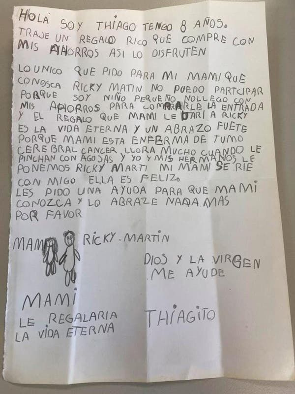 En dicha carta el pequeño relata que lo que su mamá más desea es un abrazo de Ricky Martin, además dice que su madre llora mucho después de las quimioterapias, pero su ánimo mejora y sonríe cuando él y sus hermanos le ponen las canciones del puertorriqueño.
