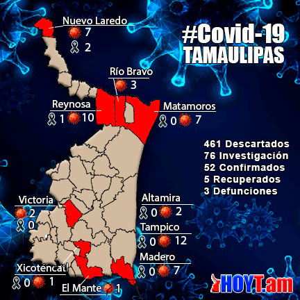 Los pacientes confirmados son: una mujer de Río Bravo, 2 hombres de Reynosa, una mujer y un hombre de Nuevo Laredo, así como un masculino de Madero que fue confirmado por medio de un laboratorio privado, con ellos suman 52 casos confirmados en Tamaulipas, 5 de ellos totalmente recuperados.