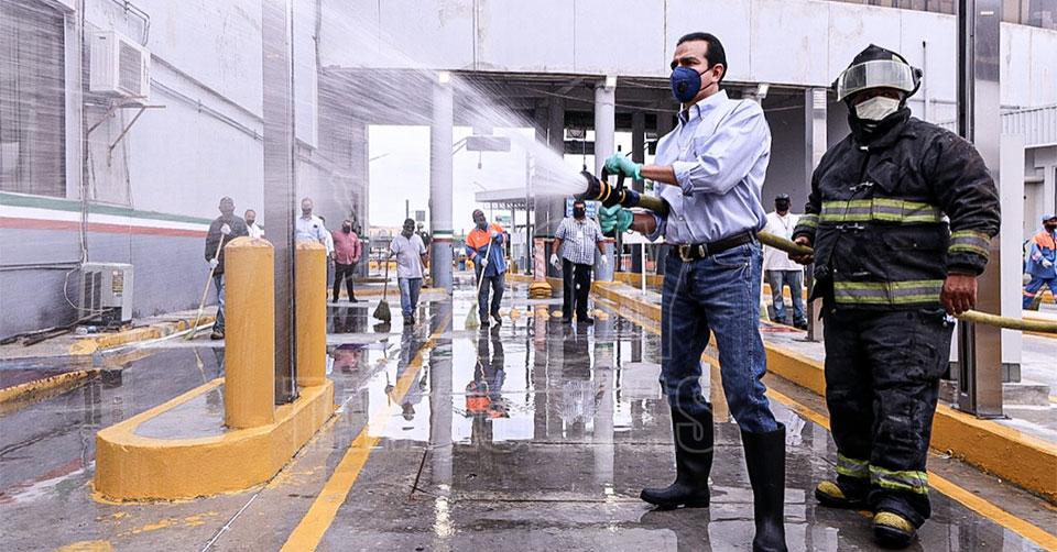 Acompañado de Omar Enríquez Sánchez, director de Protección Civil y Bomberos y elementos de la corporación, Rivas inició con la limpieza del área del cruce internacional como parte de las acciones preventivas para evitar la propagación del virus COVID-19 en Nuevo Laredo, este miércoles.