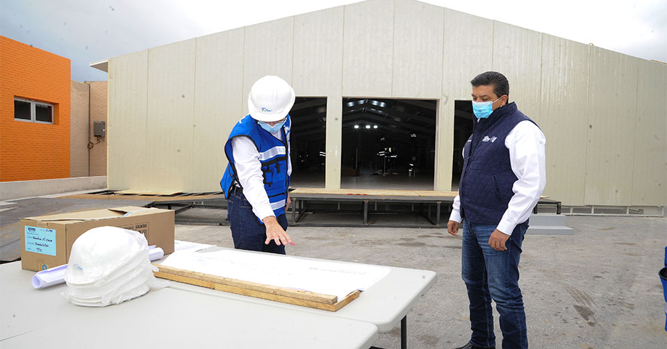 García Cabeza de Vaca supervisó los avances de la construcción del Hospital Móvil COVID-19 que se ubica contiguo al Hospital General de Ciudad Victoria.