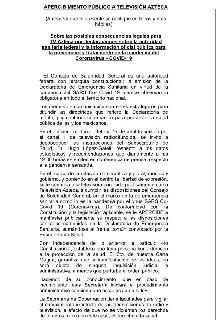 Ciudad de México, (Notimex). - La Secretaría de Gobernación dirigió un apercibimiento público a TV Azteca tras el exhorto realizado a nivel nacional de no seguir las instrucciones del Subsecretario de Salud, Hugo López-Gatell, durante la contingencia sanitaria.