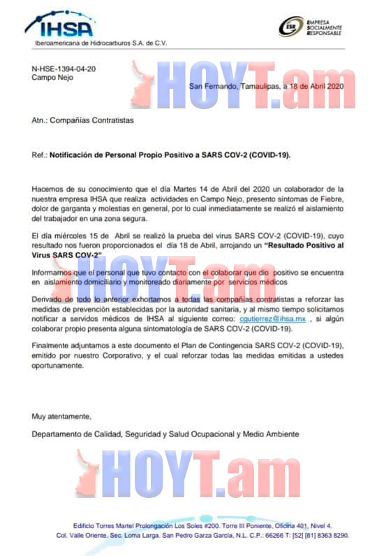 Se dio a conocer que hay cinco casos sospechosos a Covid-19 dentro de la empresa IHSA, sin embargo, esto no ha sido confirmado por la secretaría de Salud de Tamaulipas.