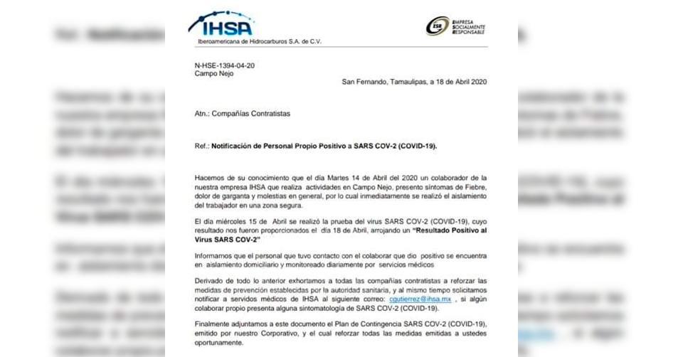 San Fernando, Tamaulipas. - Luego que la empresa Iberoamericana de Hidrocarburos S.A. de C.V. (IHSA) de San Fernando, notificara a su personal sobre un trabajador contagiado por Coronavirus, el temor de contagio entre compañeros con los que convivió el positivo, no se hizo esperar.