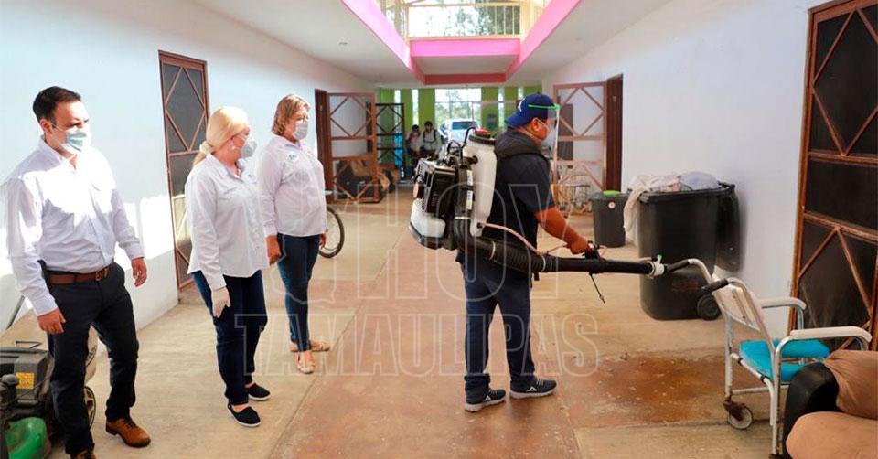 Altamira, Tamaulipas. - Con el apoyo de la Secretaría de Salud, de la Comisión Estatal para la Protección Contra Riesgos Sanitarios (COEPRIS), y de la Dirección de Atención a la Juventud, adscrita a la Secretaría de Bienestar Social, se efectuaron labores de sanitización en las instalaciones de la casa-hogar del adulto mayor “Consuelo Hinojosa de Tamez’’ (Hacienda del Abuelito), ubicada en el Fraccionamiento Laguna Florida.