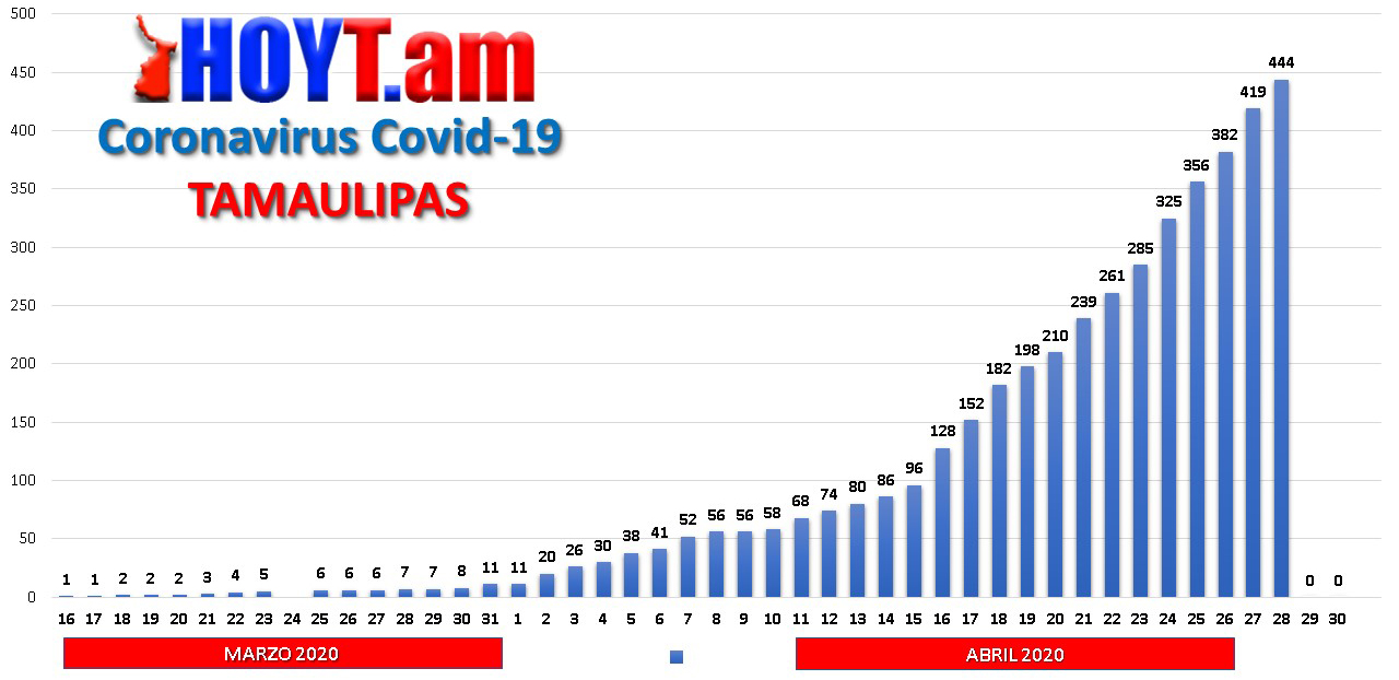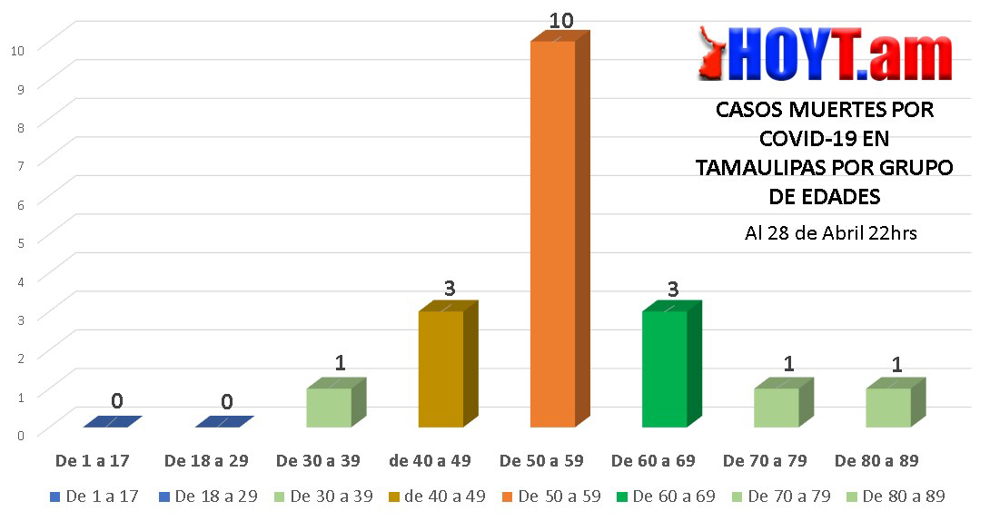 Desde del 4 de abril, cuando se registró el primer fallecimiento por Coronavirus Covid-19 en una mujer de 54 años en un hospital de Reynosa, en Tamaulipas se tienen contabilizados hasta hoy un total de 19 fallecimientos, de los cuales siete han sido en mujeres y 12 en hombres.