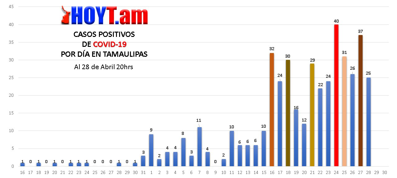 En la semana del 19 al 25 de abril, en Tamaulipas se registraron 173 casos y fue el 24, cuando se detectaron 40 nuevos casos. El 21 hubo 29.