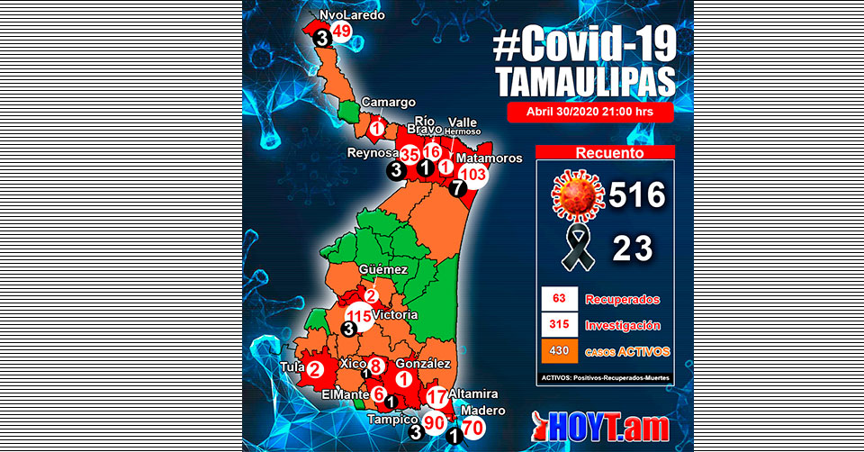 Según estadísticas, se prevé que sean las dos siguientes semanas cuando se den los mayores contagios en el país y solamente en Tamaulipas, actualmente se están analizando 315 casos y de estos 92 están en Ciudad Victoria, 54 en Matamoros, 42 en Xicoténcatl, 31 en Nuevo Laredo, 29 en Ciudad Madero y 24 en Tampico.