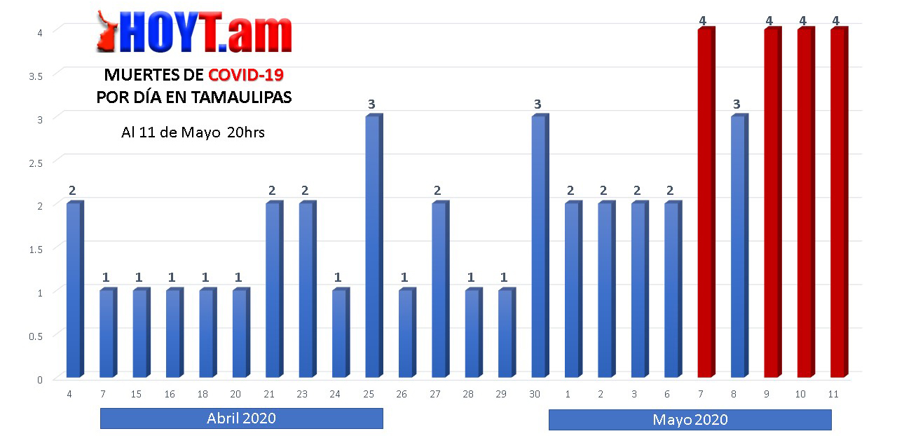 En dos días de la recién semana epidemiológica 20, el número de fallecidos es de ocho, cuatro el domingo y cuatro ayer lunes; durante la anterior, la número 19, en Tamaulipas se registraron 15 defunciones.