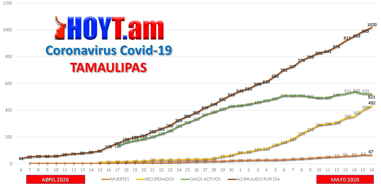 Con estas cifras el conteo oficial en Tamaulipas asciende a 1,020 positivos, 67 defunciones y 432 recuperados
