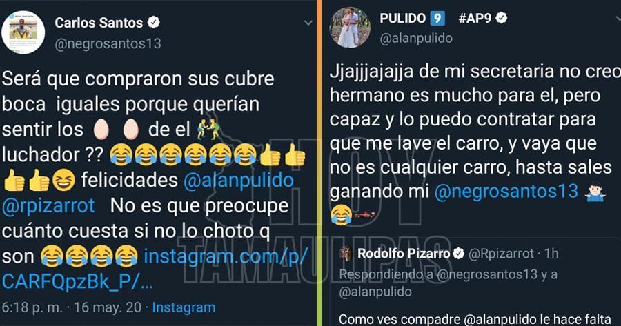 “Será que compraron sus cubrebocas iguales porque querían sentir los… (imágenes de huevos) del luchador??... felicidades @alanpulido @rpizarrot No es que preocupe cuánto cuesta si no lo choto que son”, escribió “Negro” Santos en su cuenta de Twitter.