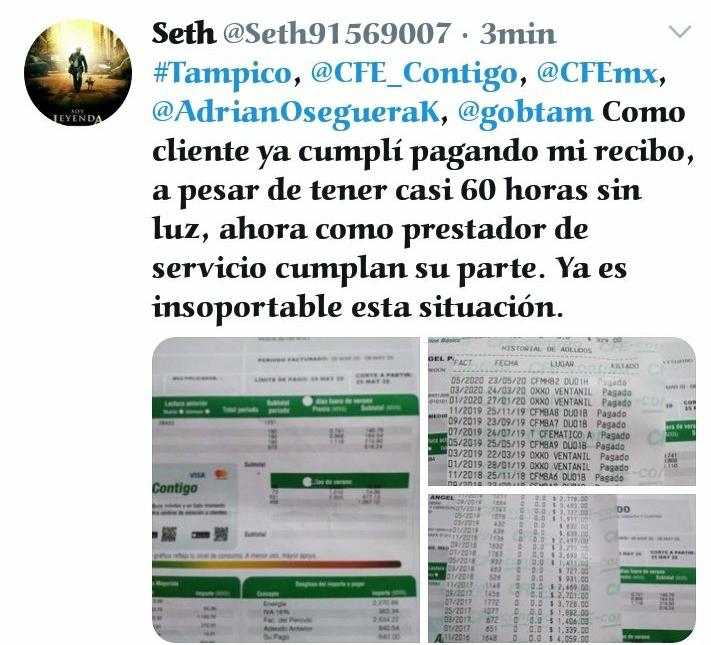 "Aún sin luz reporte U0103689735, ya son 60 horas. Ya vamos para 3 días sin servicio. Calle Abasolo entre av. Álvaro Obregón y Allende, col. Hipódromo de cd. Madero, somos más de 20 familias afectadas", refirió.