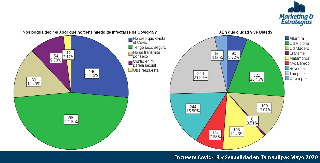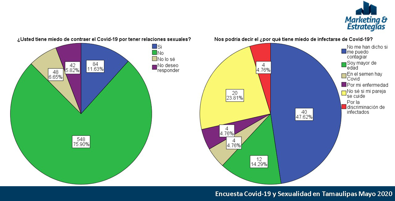 En contraparte, del 11.6 por ciento que indicó tener miedo de contagiarse por Covid-19 por mantener relaciones sexuales, un 47.6% argumentaba que no tiene información sobre si mantener relaciones sexuales pudiera contagiarlo, el 14.3% indicaba que temía porque era mayor de edad, mientras que el 23.8% señaló que le daba miedo al no tener la certeza si su pareja sexual se cuidaba.