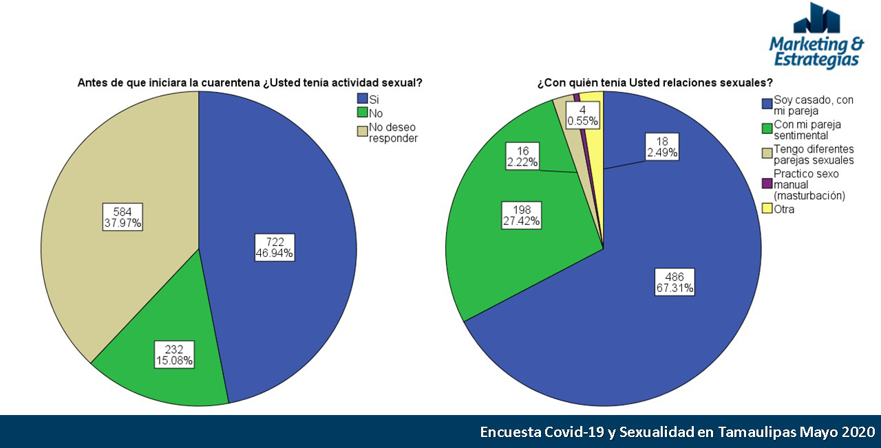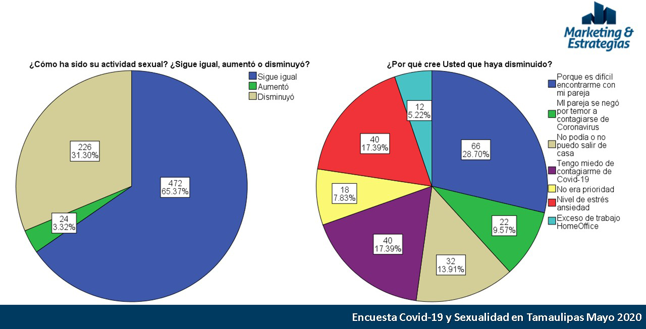 Ciudad Victoria, Tamaulipas.- Tras el confinamiento obligatorio por la pandemia del Coronavirus Covid-19 iniciado a mediado de marzo, al menos el 31.3 por ciento de los tamaulipecos aceptaron que su actividad sexual había disminuido, esto tras participar en una encuesta realizada por Marketing & Estrategias.
