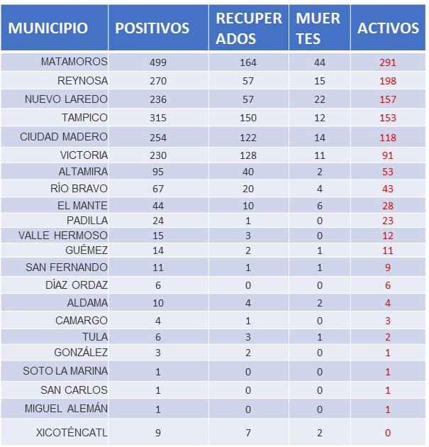 Y es Matamoros el que más casos activos tiene al momento, al contabilizar 291 de los 499 que han dado positivo. En este municipio 164 han recuperado su salud y 44 fallecieron.