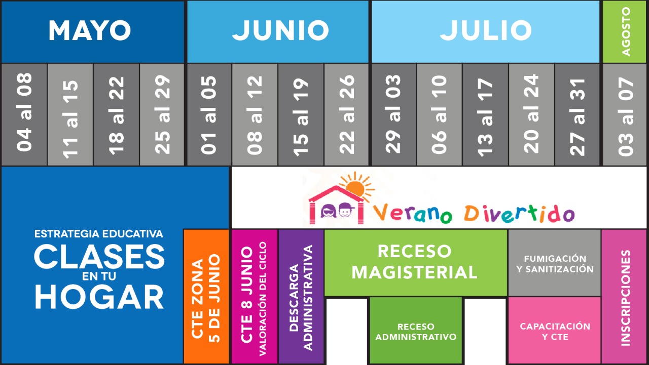 Entre las actividades más relevantes del calendario estatal presentadas durante la transmisión están las siguientes: para el día 5 de junio el Consejo Técnico Escolar (zona) y para el 8 de junio el Consejo Técnico Estatal (CTE). Las vacaciones para los estudiantes de Educación Básica “Verano divertido” serán del 8 de junio al 28 de agosto, el receso magisterial del 22 de junio al 17 de julio, el receso administrativo 29 de junio al 10 de julio, mientras que del 3 al 7 de agosto se están considerando las inscripciones al siguiente ciclo escolar.