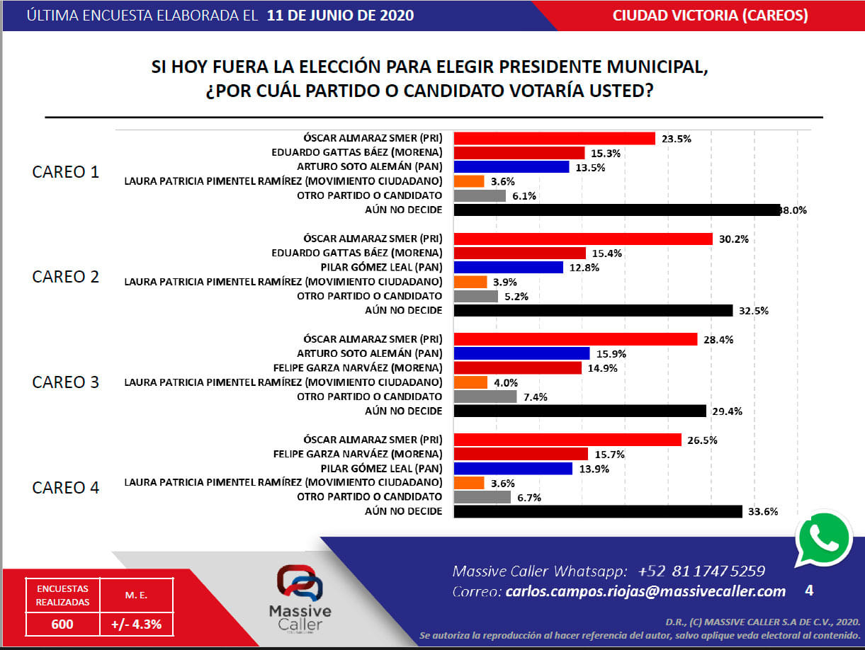 Ciudad Victoria, Tamaulipas.- De ser hoy las elecciones para elegir al nuevo alcalde de Ciudad Victoria, el priísta Óscar Almaraz Smer sería el vencedor en el proceso electoral en cualquier escenario y careo con cualquier otro candidato, esto de acuerdo a la encuesta publicada por Massive Caller.