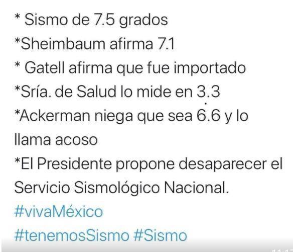 Uno de los más llamativos es donde el presidente de la República propone desaparecer al Servicio Sismológico Nacional, mientras que la jefa de Gobierno de la Ciudad de México, Claudia Sheinbaum afirma que fue de 7.1 grados y el subsecretario de Salud Federal, Hugo López-Gatell afirma que fue importado.
