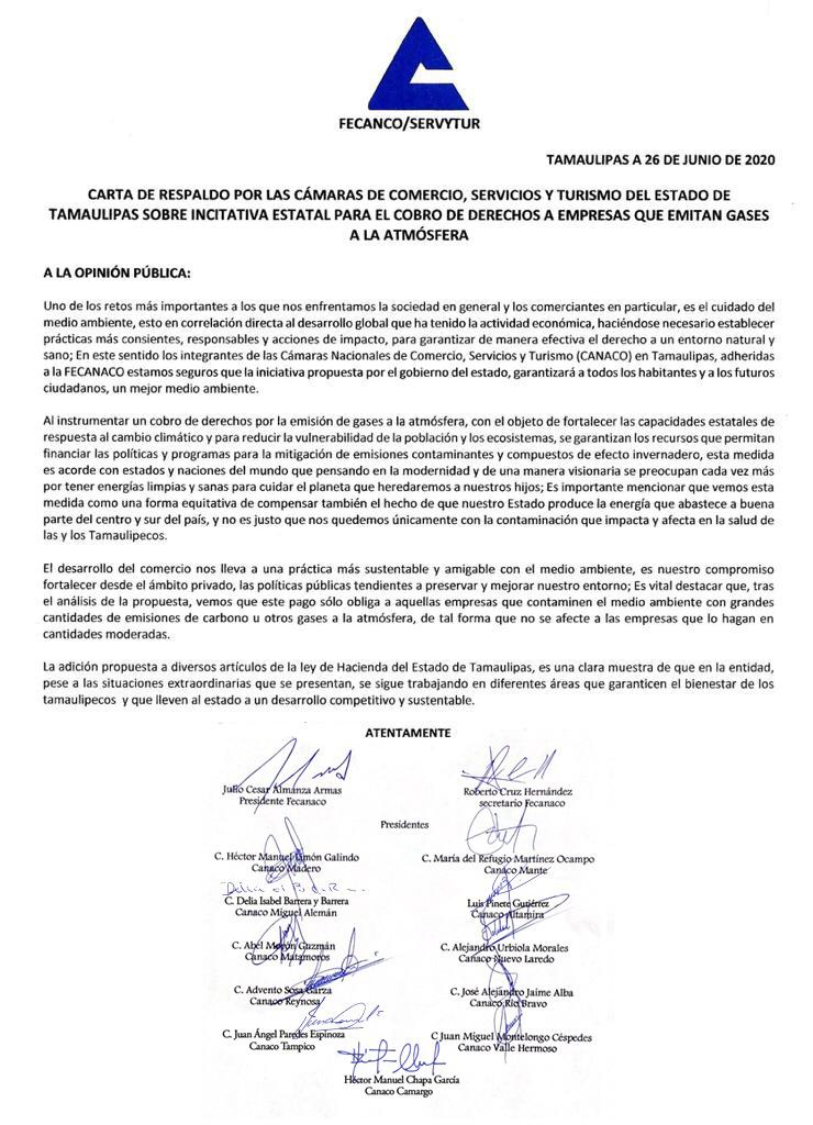 La carta es firmada por el Presidente de FECANACO, Julio César Almanza Armas y el Secretario Roberto Cruz Hernández, además de los presidentes de las Canaco Héctor Limón Galindo, Madero; María del Refugio Martínez, El Mante; Delia Barrera y Barrera, Miguel Alemán.
