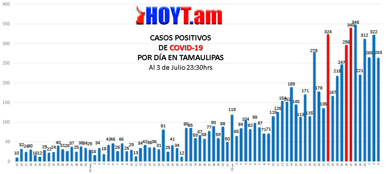 Aún así, durante la Semana Epidemiológica 27, que inició el 28 de junio y concluyó el 4 de julio, hubo picos importantes, por ejemplo, el 28 hubo 348 casos confirmados y se mantuvo la cifra por arriba de las 220 infecciones. Ayer se concluyó con 263 casos positivos.