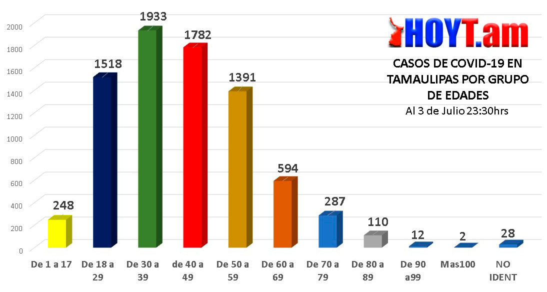 El grupo entre los 30 y 39 años de edad, continúa siendo el que más contagios de Covid-19 tiene en Tamaulipas, al registrar esta semana 1,933 infecciones, 429 más que la semana anterior. Lo mismo ocurre con las personas entre 40 a 49 años que hasta ayer sábado contabilizaban 1,782, un total de 382 más que en la semana pasada.