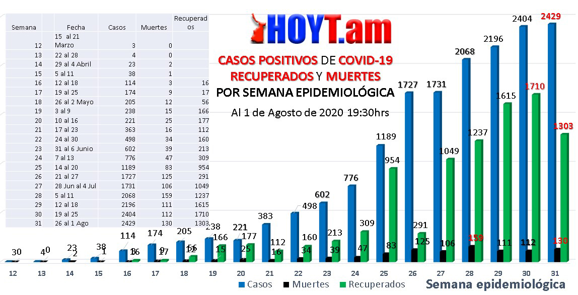 También durante estos últimos días hubo 130 personas que murieron a consecuencia de esta pandemia y solamente 1,303 personas recuperaron su salud, 400 menos que la semana pasada.