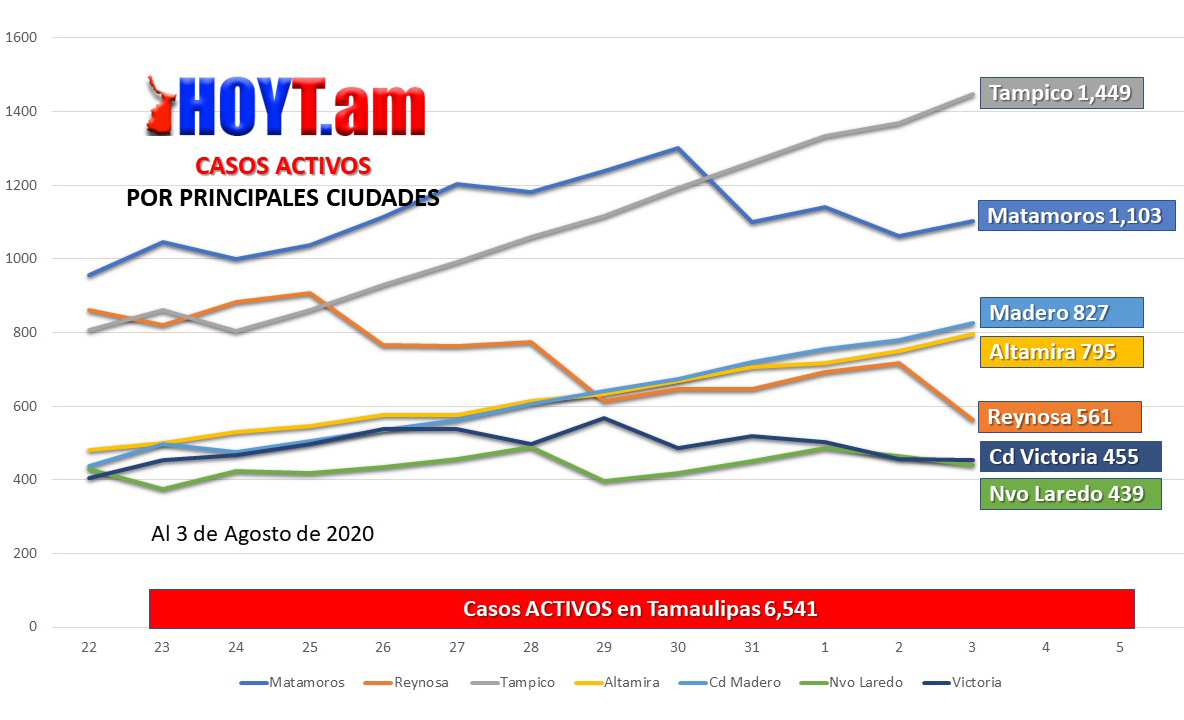 La funcionaria estatal detalló que los nuevos casos se presentaron 46 en Altamira, 47 en Ciudad Madero, nueve en El Mante, 55 en Matamoros, dos en Méndez, 14 en Nuevo Laredo, dos en Ocampo, 43 en Reynosa, uno en Río Bravo, dos en Soto la Marina, 80 en Tampico, dos en Valle Hermoso, 26 en Ciudad Victoria y dos en Xicoténcatl.