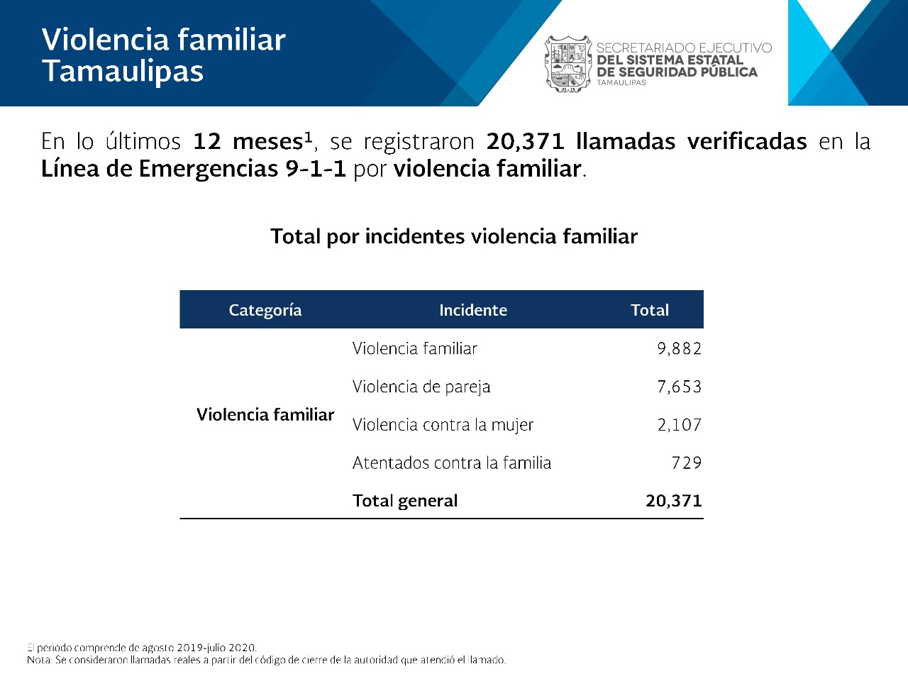Ciudad Victoria, Tamaulipas. – En los últimos 12 meses se han registrado en Tamaulipas 20 mil 371 llamadas al 911 por violencia familiar, destacando que estas se concentran en ocho municipios, de acuerdo al reporte anual del Secretariado Ejecutivo del Sistema Estatal de Seguridad Pública. Según sus estimaciones el incremento fue del uno por ciento.