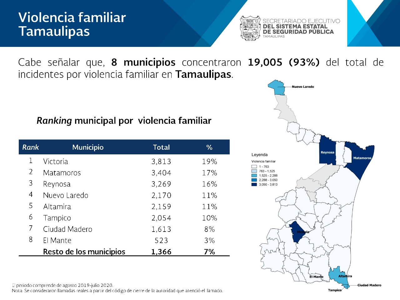 La estadística muestra que tan solo ocho municipios concentraron el 93 por ciento del total de llamadas, es decir 19,005, siendo éstos Ciudad Victoria con 3,813; Matamoros con 3,404; Reynosa 3,269; Nuevo Laredo 2,170; Altamira 2,159; Tampico 2,054; Ciudad Madero 1,613 y El Mante 523.