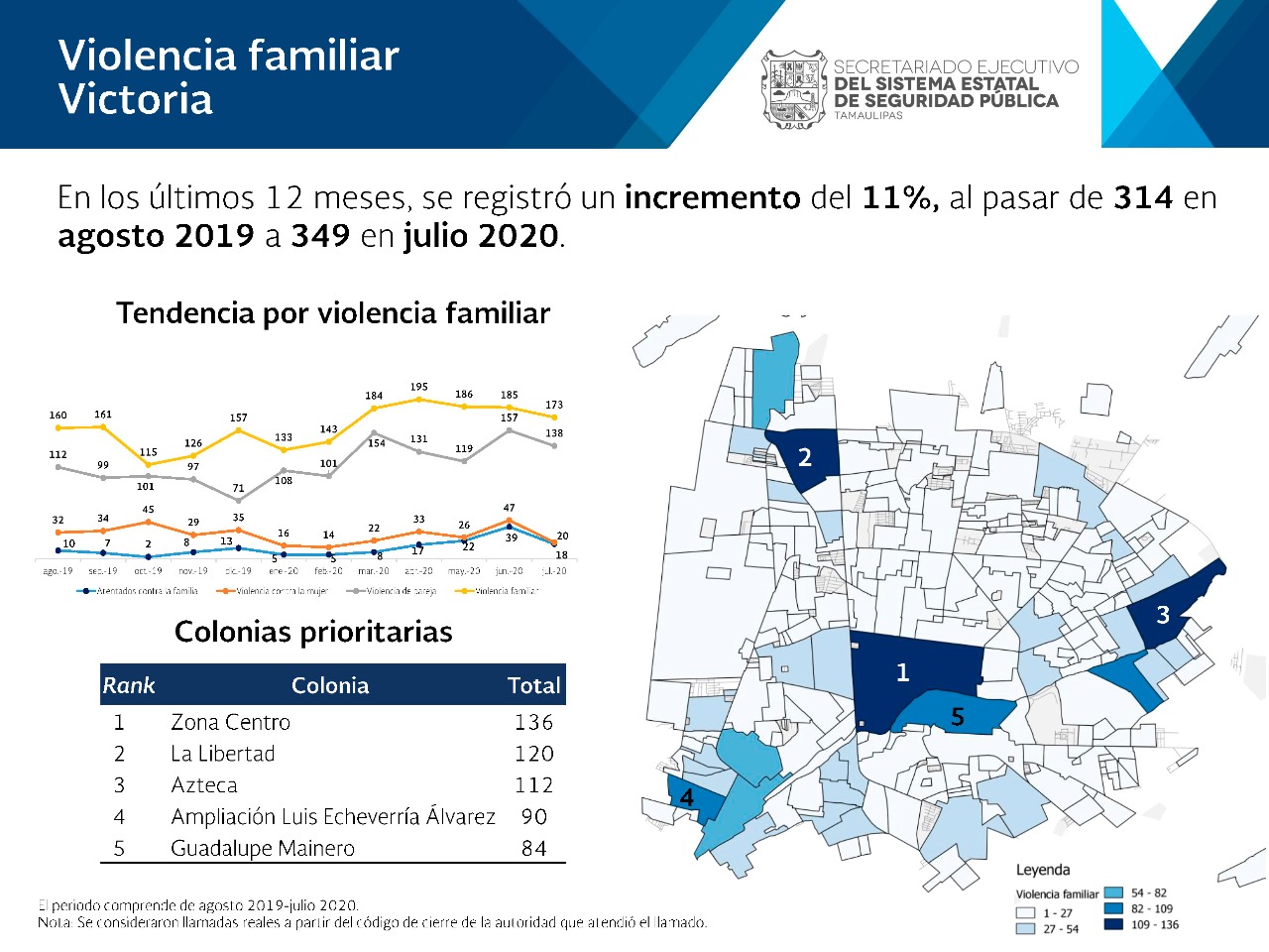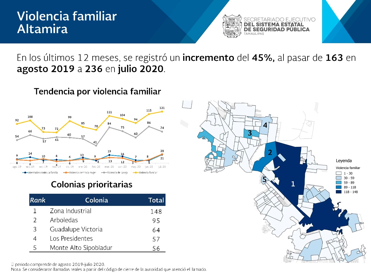 También en hubo un aumento en Altamira y las colonias prioritarias son Zona Industrial, Arboledas, Guadalupe Victoria, Los Presidentes y Monte Alto Sipobladur; en Tampico el incremento fue del seis por ciento y las colonias son Solidaridad, Voluntad y Trabajo, Morelos, Tamaulipas, Zona Centro y la Vicente Guerrero.