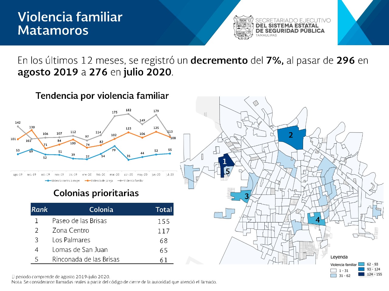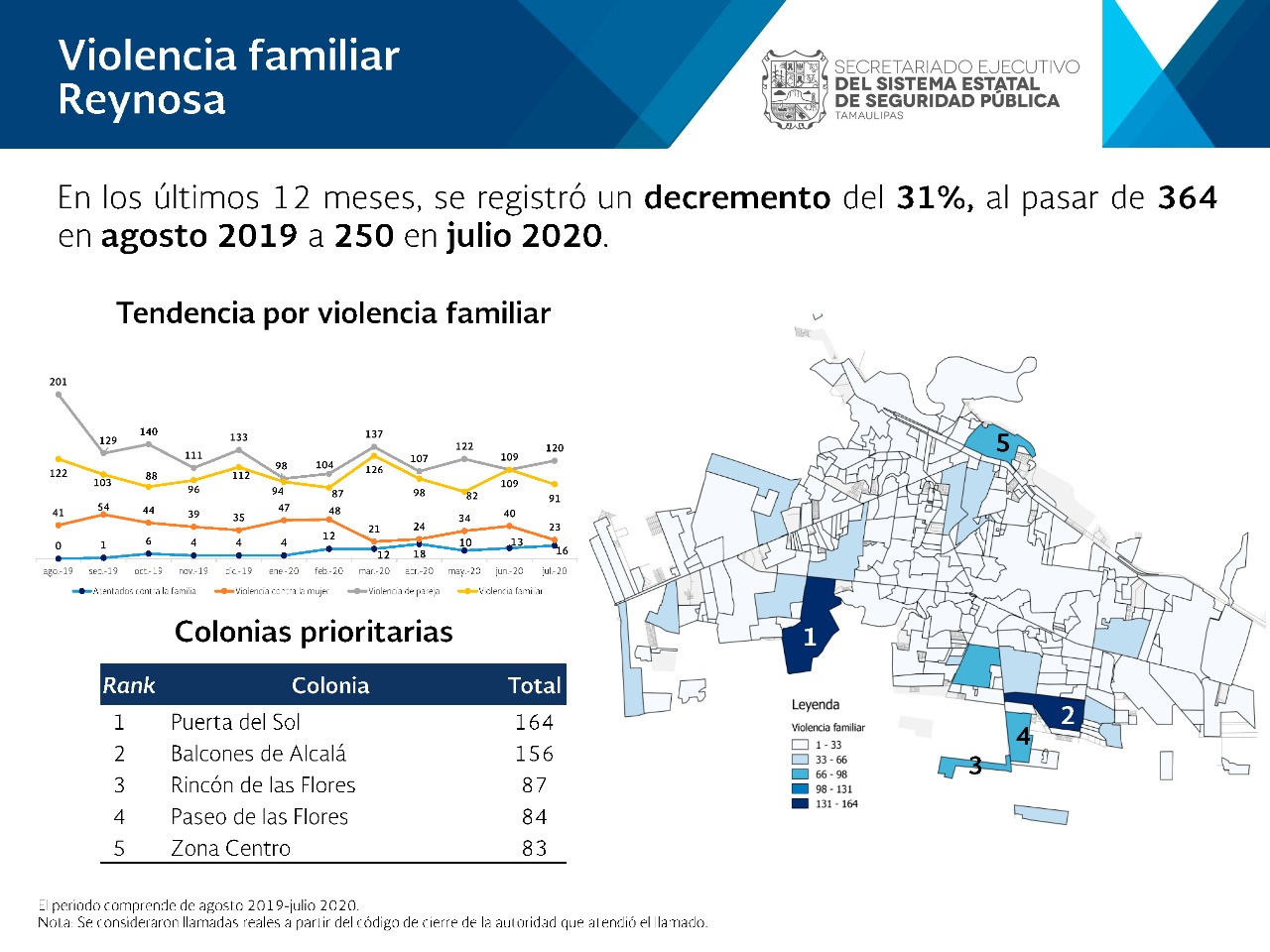 Mientras que en Matamoros hubo un decremento del siete por ciento, contándose como colonias prioritarias Paseo de las Brisas, Zona Centro, Los Palmares, Lomas de San Juan y Rinconada de las Brisas; en Reynosa el decremento fue del 31 por ciento y las colonias son Puerta del Sol, Balcones de Alcalá, Rincón de las Flores, Paseo de las Flores y Zona Centro.