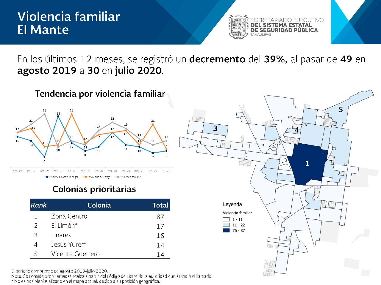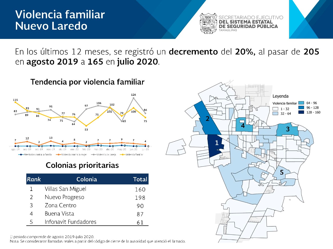 También en Nuevo Laredo hubo una disminución del 20 por ciento y las colonias prioritarias son Villas San Miguel, Nuevo Progreso, Zona Centro, Buena Vista e Infonavit Fundadores; en El Mante el decremento fue del 39 por ciento y las colonias son Zona Centro, el Limón, Linares, Jesús Yurem y la Vicente Guerrero.