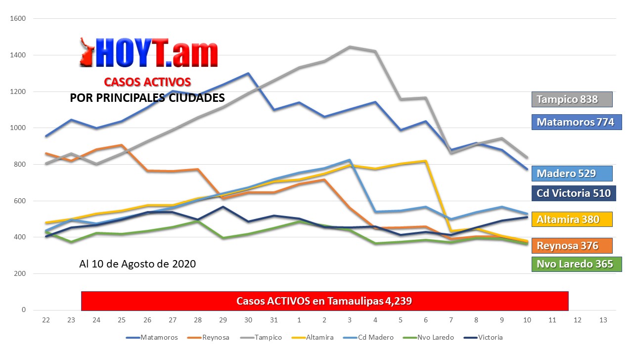 En contraparte, Matamoros cayó de 880 a 774 casos y Reynosa continúa a la baja al pasar de 406 a 376 casos activos.