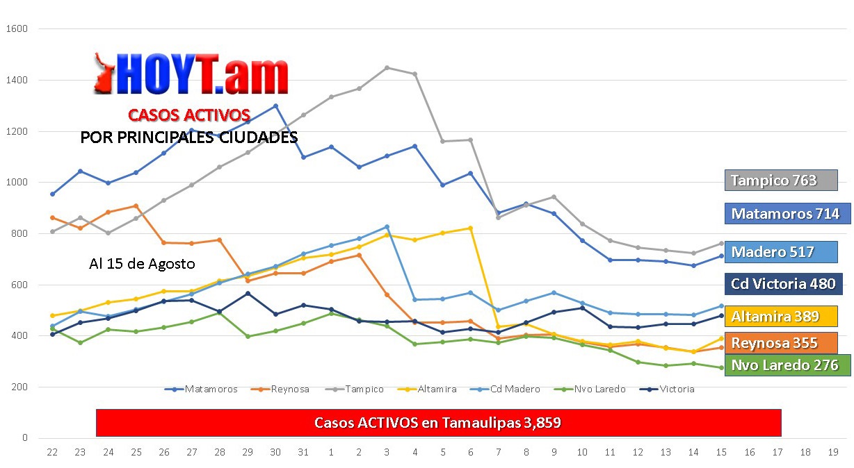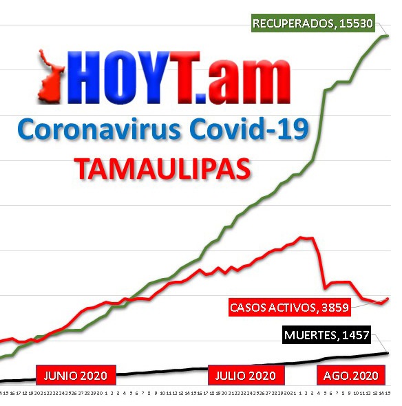El 9 de agosto cuando inició la Semana Epidemiológica 33, en Tamaulipas había 4,598 tamaulipecos infectados por el virus SARS-CoV2 que provoca la enfermedad de Covid-19 y conforme pasaron los días, la curva fue cediendo y el viernes se ubicaba en 3,641 casos; pero, ayer sábado volvió a subir y quedó en 3,859.