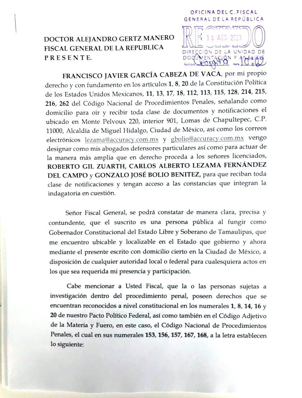 Para ello, en el oficio con acuse de recibo este 19 de agosto, el mandatario tamaulipeco nombró como sus abogados defensores a Roberto Gil Zuarth, Carlos Alberto Ledama Fernández del Campo y Gonzalo José Bolio Benítez “para que reciban toda clase de notificaciones y tengan acceso a las constancias que integran la indagatoria en cuestión”.